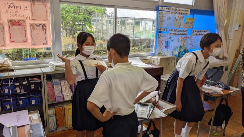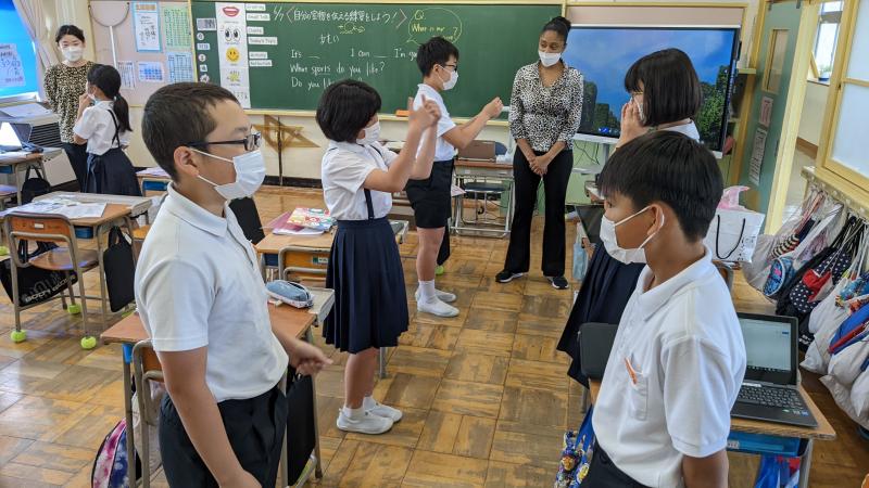 外国語の学習の様子です。ペアで会話の練習です。ジェスチャーを加えれば、より伝えたいという気持ちが表現できます。