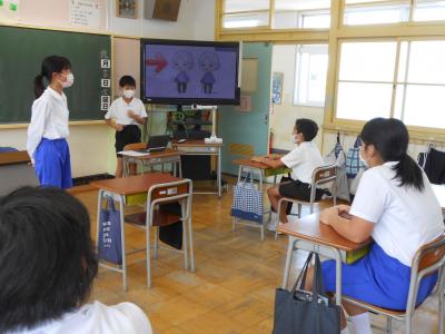 外国語の授業で、5年生は6年生に地域の身近な人をパソコンを使いながら紹介しました。