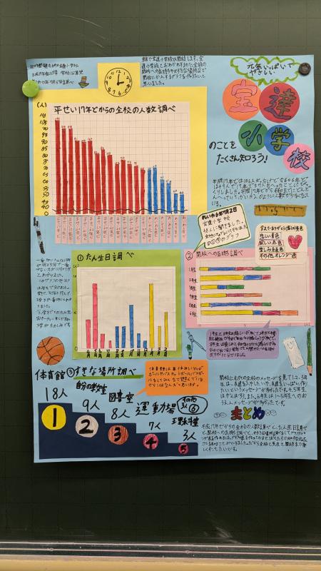 3年生が取り組んでいた統計グラフコンクール作品が完成しました。自分たちで話し合って決めたテーマに、Chromebookを使ってとったアンケートの結果を写真のような作品にまとめました。3年生のチームワークはバッチリです。