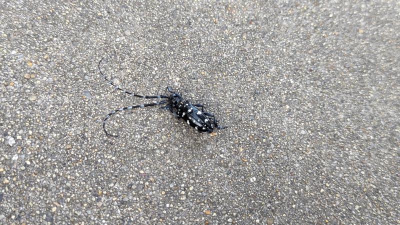 答えは「ゴマダラカミキリ」ですね。先日、赤い「ベニカミキリ」を見かけたばかりですが、今日は白い斑点模様のカミキリムシです。