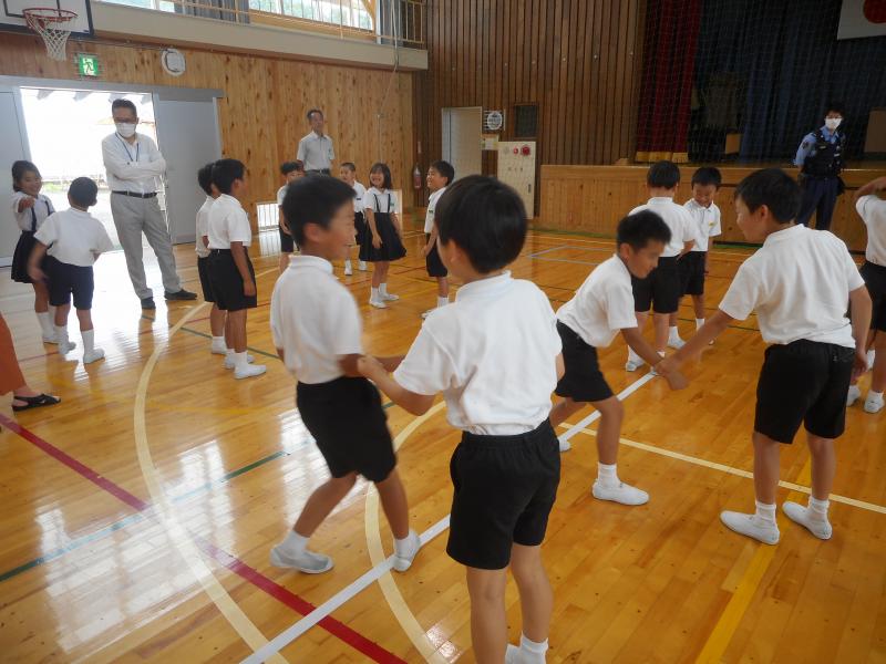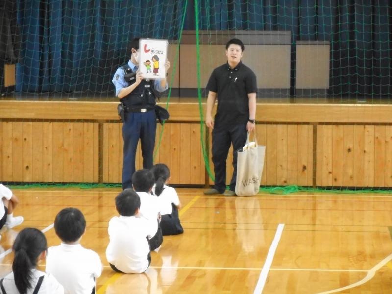 1学期最後の避難訓練は、不審者対応訓練・防犯教室でした。今年は、夏休みに入る前のこの時期に設定しました。羽咋警察署・河原駐在所の職員の方を講師にお招きし、学校に不審者が侵入したとの想定で、職員の対応や児童の避難行動について訓練しました。その後、体育館で職員の方からお話をしていただきました。