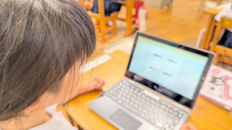宝達小学校閉校まであと半年となりました。閉校記念品は、小学校名と自分の氏名が印字された多機能ペンです。それぞれの希望の色を選ぶことができます。この日は1年生が、自分のChromebookを使って希望の色を申し込む活動をしていました。