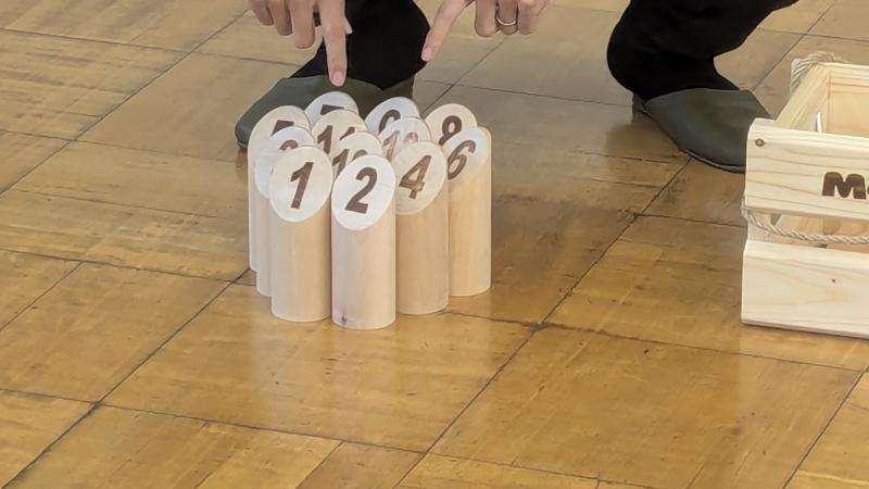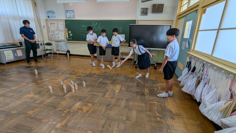 地域おこし協力隊の櫻井さんを講師にお招きして、モルックの講習会を行いました。総合的な学習の時間で、ユニバーサルスポーツなどについて調べている子どもたちが、フィンランド発祥の「モルック」に注目し、実際に体験することになりました。今度の授業参観でも、保護者の方々といっしょに大会を行う予定です。
