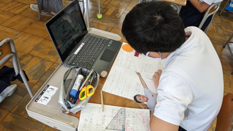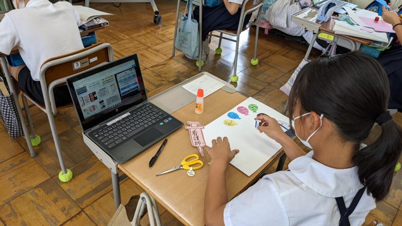 総合的な学習の時間で、将来の夢について話し合っています。この日は、その夢をシートに表現する学習に取り組みました。