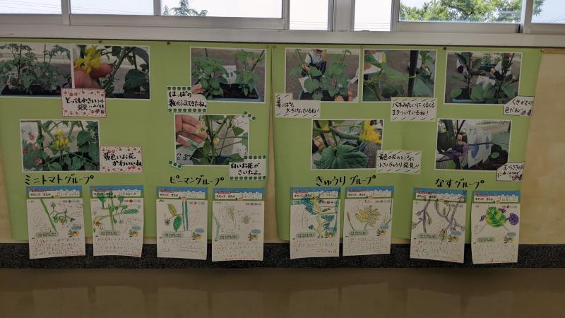 2年生は、生活科でいろいろな夏野菜をプランターで育てています。水やりも責任をもってしっかりとやっています。写真は観察記録です。一人一人が自分の記録シートに丁寧に書き込んでいます。廊下に掲示しましたので、授業参観のときにご覧下さい。