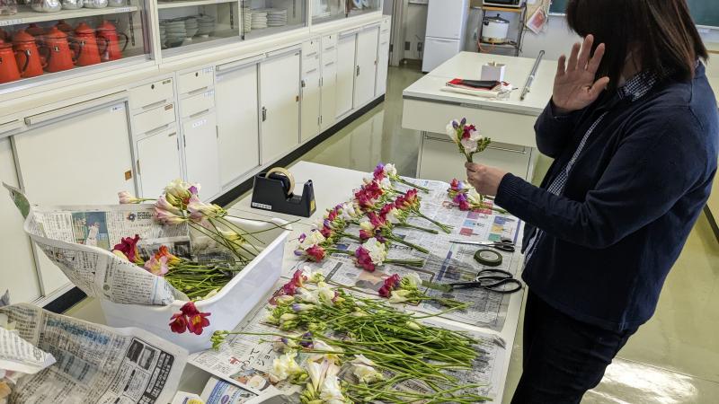校務員の越野さんが、卒業生のためにコサージュを手作りしてくださっています。