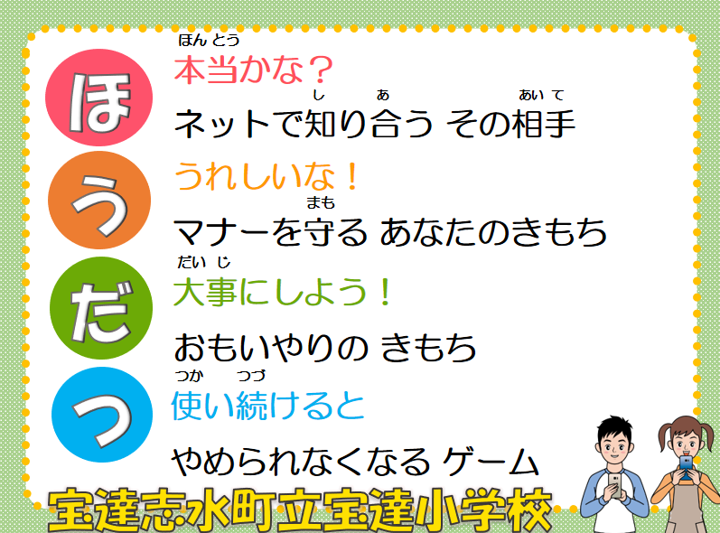 宝達小学校の「ほうだつ」の文字で標語を作っていただきました。