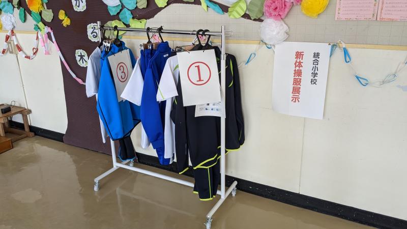 統合小学校の体操服の見本が児童玄関に展示されています。授業参観の日に保護者の方にもご覧いただき投票していただきます。授業参観前でもご覧いただくことは可能ですので,お時間のある方は学校までお越しください。時間は7:30〜17:30とさせていただきます。