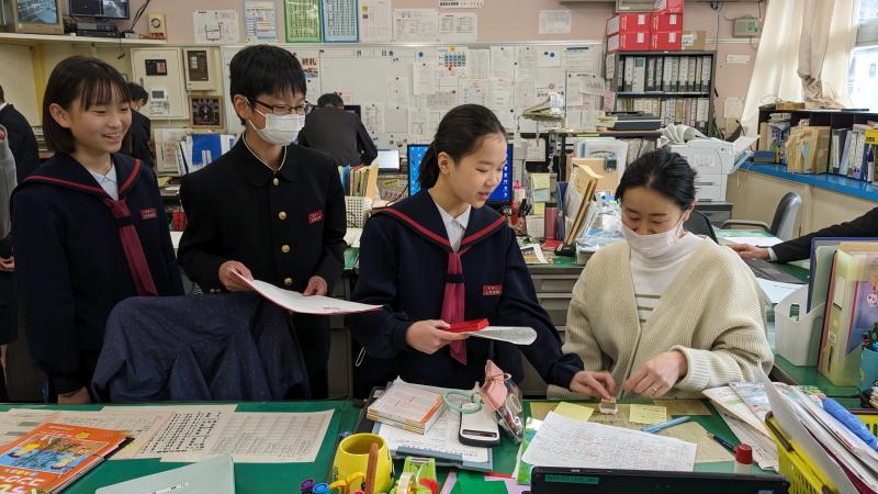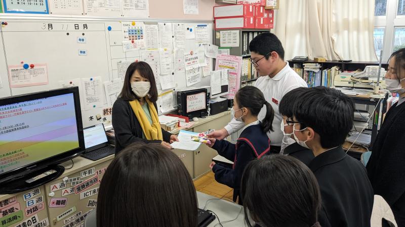 卒業プロジェクトをお世話してくださった土肥先生にサプライズです。お手紙と記念品が渡されました。土肥先生は、自分にももらえたことにびっくりしていました。土肥先生に気づかれないところで準備していたようです。