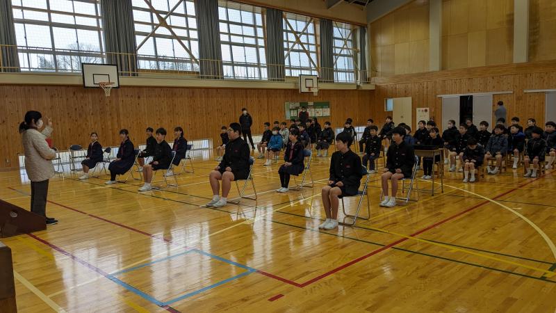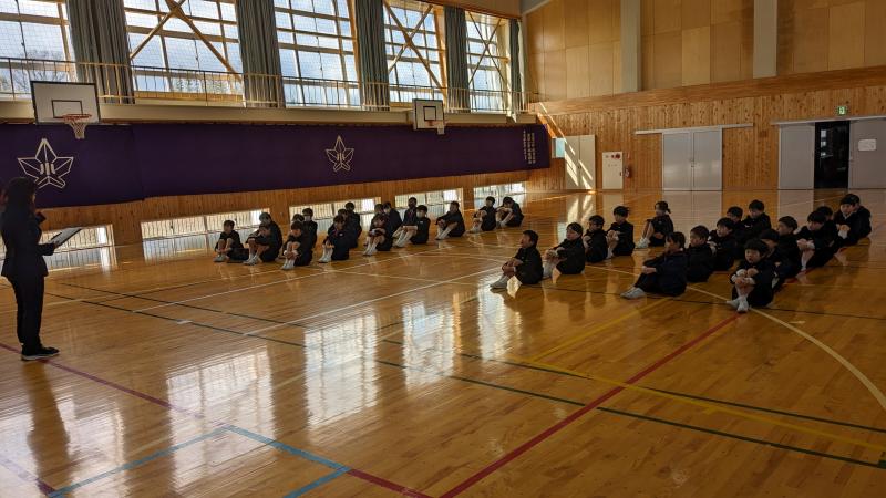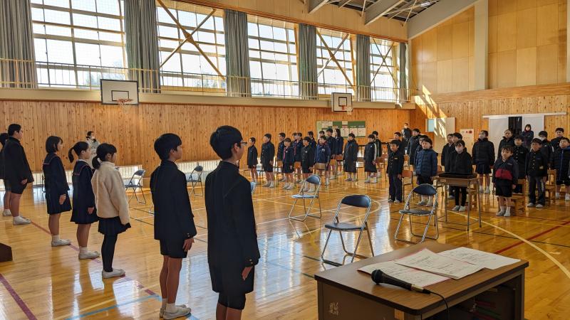 3年生が体育館で校歌の練習をしていました。春の運動会に向けてすでに準備が始まっています。