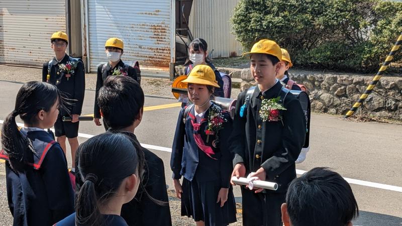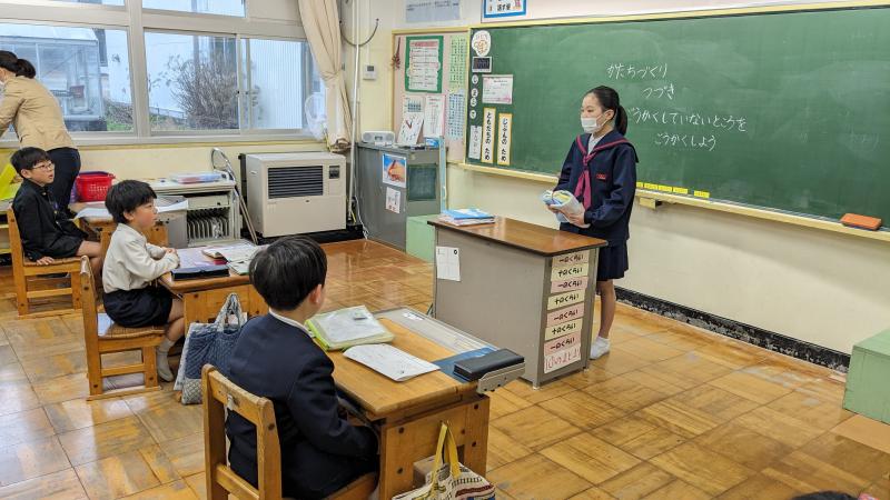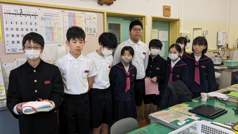 今日の朝ドリルの前に、6年生が下級生のクラスを回って手作り雑巾のプレゼントを渡していました。閉校まであと1年となった学校を最後まできれいに使ってほしいとの気持ちがこもっています。
