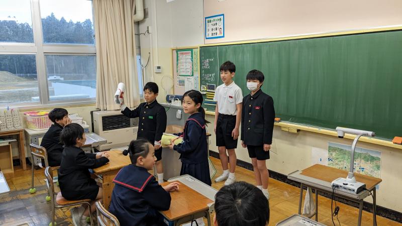 6年生の「卒業プロジェクト」が着々と進んでいます。プロジェクトの中の一つに、卒業生が下級生にプレゼントすることになっています。写真は、各学級を回るリハーサルをしているところです。