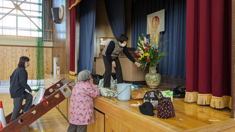 入学式や卒業式などの大きな儀式の際は、地域の方の力をお借りしておます。写真は、ステージの生花を見ていただいている様子です。