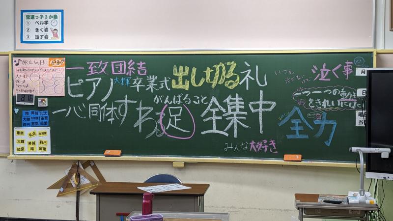 今朝の6年教室の黒板です。卒業生の気合が伝わってきますね。明日をお楽しみに。なお、卒業式の動画をYou Tubeにアップロードしますので、お越しになれなかったかたはそちらでお楽しみください。