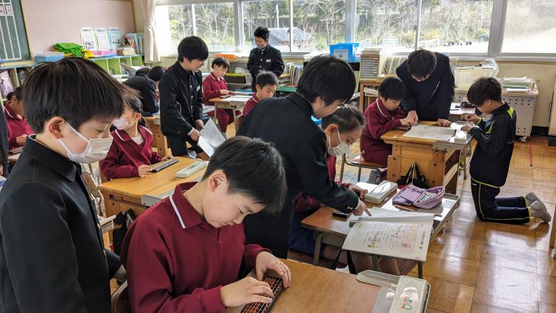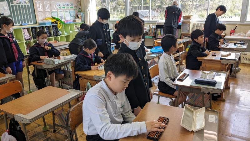 4年生が3年生にそろばんの使い方を教えてくれています。来年度は、4・5年生の複式学級となる子どもたちです。もうすでにチームワークはバッチリです。
