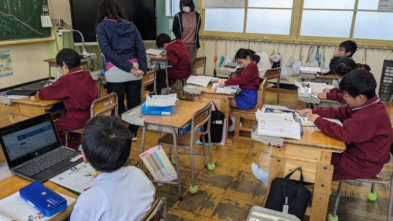 来年度複式学級になる1・2年生が、いっしょに外国語活動の勉強をしていました。2年生が1年生に良いお手本を見せてくれています。ありがとうございます。
