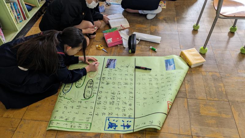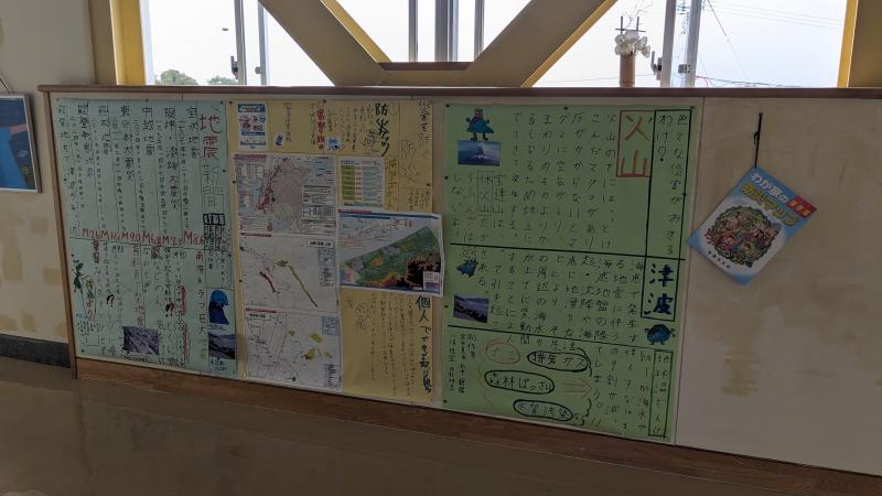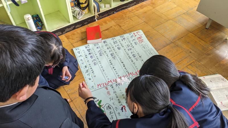 5年生が防災の学習のまとめをしていました。模造紙は、北階段を上がったところに掲示しました。全校児童に見てほしいと思います。