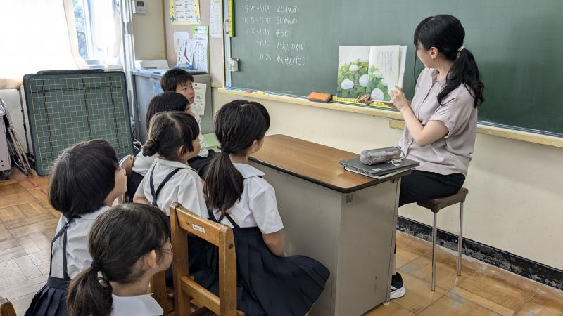 2年生の算数の授業で、計算の方法がわからず困っている児童に、分かりやすく説明してくれている様子が見られました。2年生のチームワークはバッチリです。