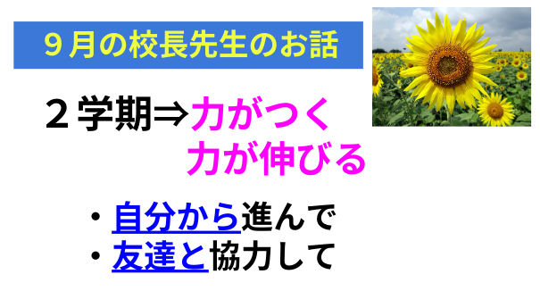 いよいよ2学期がスタートしました。さすが6年生です。友だちと意見を交わす姿が、最初の算数の授業でも見られます。友だちと話し合うことで意欲が高まり理解も深まります。最上級生の活躍を期待しています。
