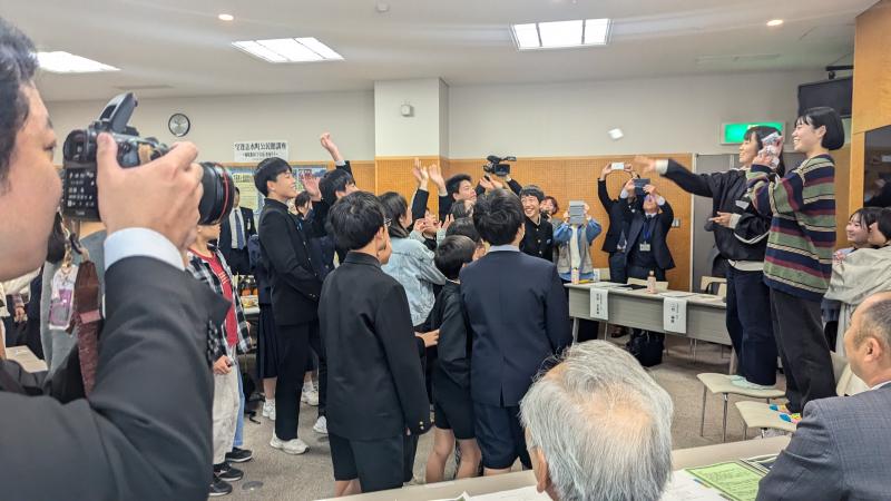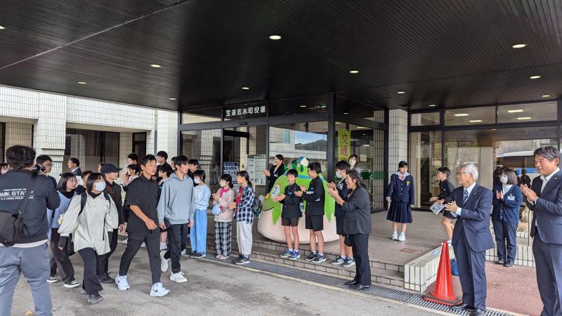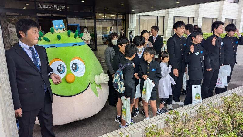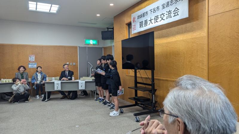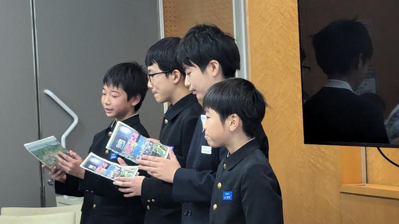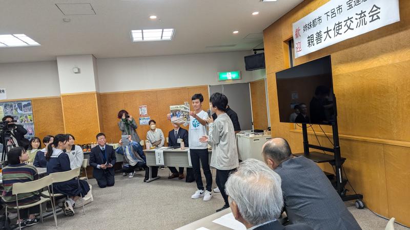 本町と姉妹都市である岐阜県下呂市の親善大使が本町を訪問しました。宝達志水町役場で交流会があり、本校6年の杉中さん・西野さん・山口さん、5年の大窪さんが町内の小学生を代表して参加しました。昨年度の5・6年生が総合的な学習の時間で作成した、PRパンフレットを使って、本町の紹介をしました。