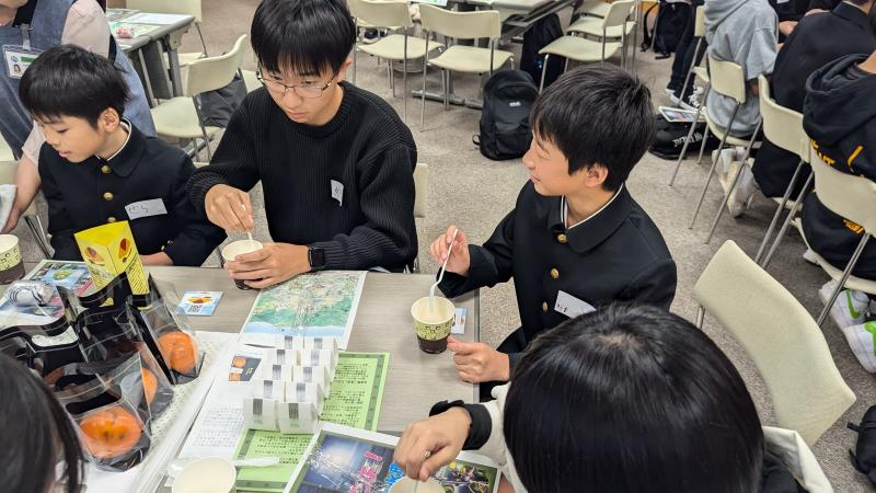 地元の特産「紋平柿」生産者「宝正菓」の宮本さんを講師にお招きし、「紋平柿出前講座」を開催しました。柿の種類から、「紋平柿」の渋抜きの作業など、宮本さんの熱い思いとともにお話ししていただきました。
