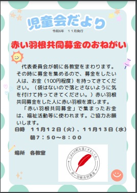 今週は、児童会代表委員会が中心となり、赤い羽根共同募金活動に取り組んでいます。ご協力ありがとうございます。明日15日が最終日となります。宜しくお願いします。
