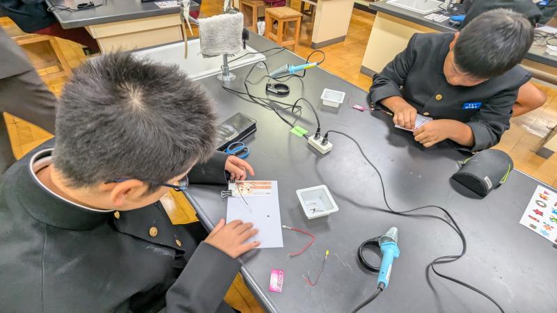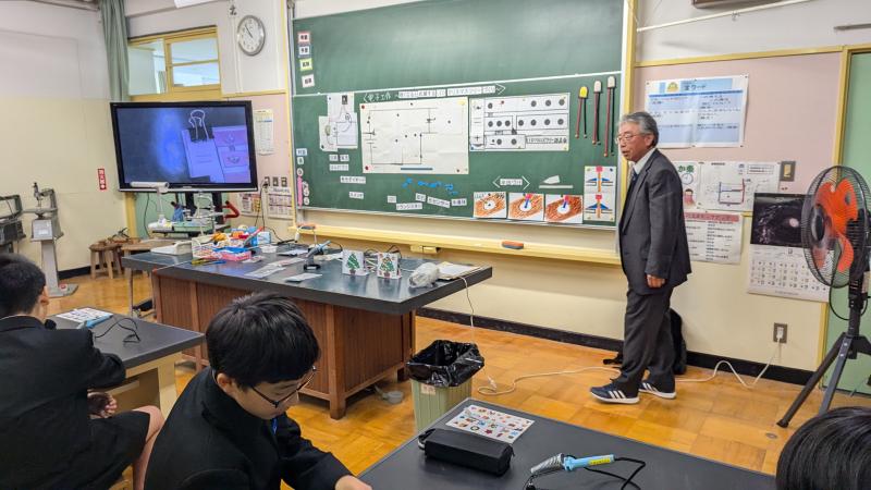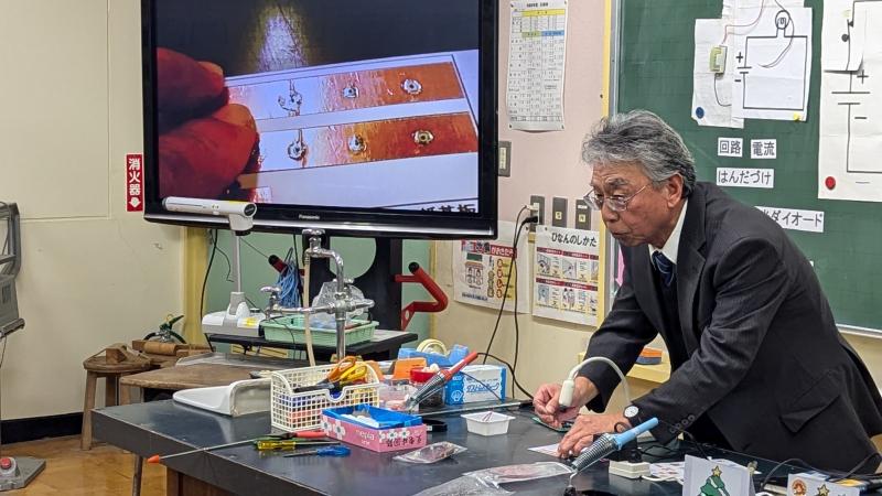 菖蒲田先生を講師に迎え、今年最後の「科学実験教室」がありました。LED電球を使ったクリスマスツリーのディスプレイ作りに挑戦しました。紙基盤に貼られた銅板に導線をはんだ付けする作業はなかなか難しいと思いますが、6年生全員が自分の力で取り付けすることができました。