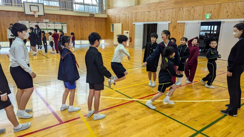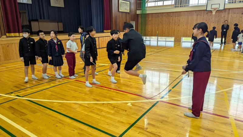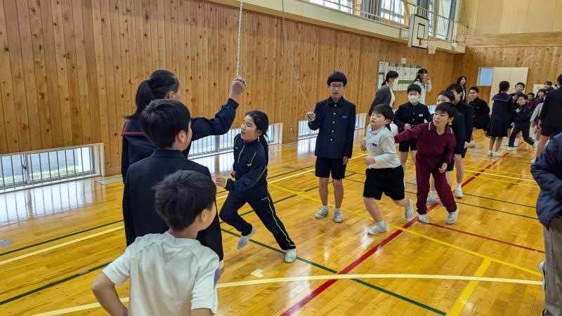 いよいよ縄跳びのシーズンです。子どもたちは、朝登校後、休み時間、昼休みに個人で練習しています。この日は長休みに、縦割り班ごとに8の字跳びに挑戦しました。1年生はまだうまく跳べませんが、上級生が入るタイミングなどを教えてくれています。