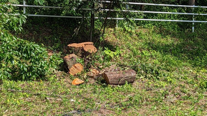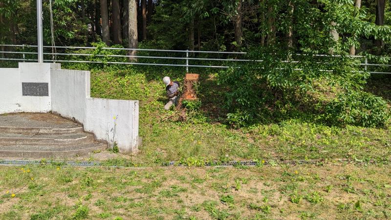 創立当時から植えられていたと思われるサクラの立ち枯れが目立ってきました。地域の方から伐採しないと危険ではないかとのご指摘がありましたので、町教委にお願いして伐採していただきました。
