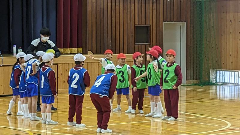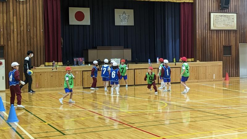 1・2年生が合同体育でサッカーに取り組みました。来年、2・3年の複式学級で同じクラスになる子どもたちです。