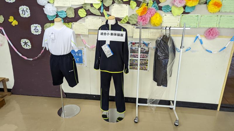 現在、児童玄関前廊下に統合小学校の体操服を展示しています。来週の授業参観まで展示しますが、朝や夕方の時間帯に見に来ていただいても結構です。※時間帯は、7:30〜16:35とさせていただきます。