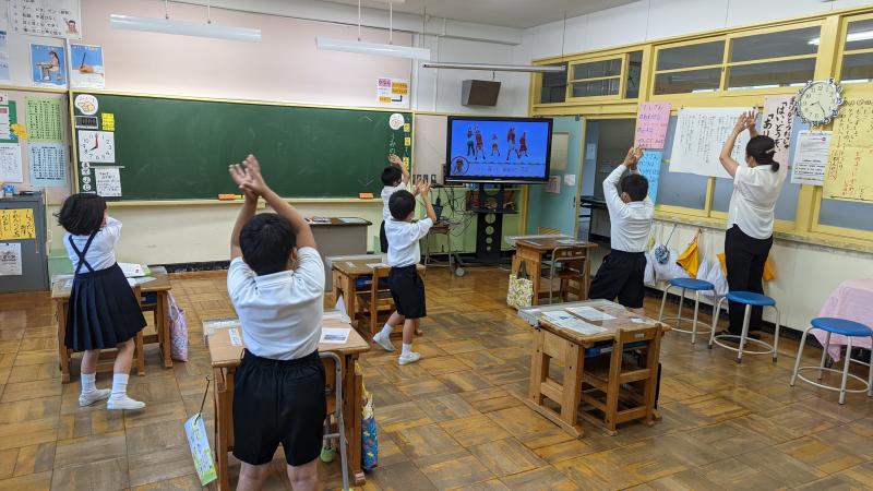 今月の朝の歌は「パプリカ」です。Youtube動画を見ながら、ダンスと歌の練習をする1年生の様子です。
