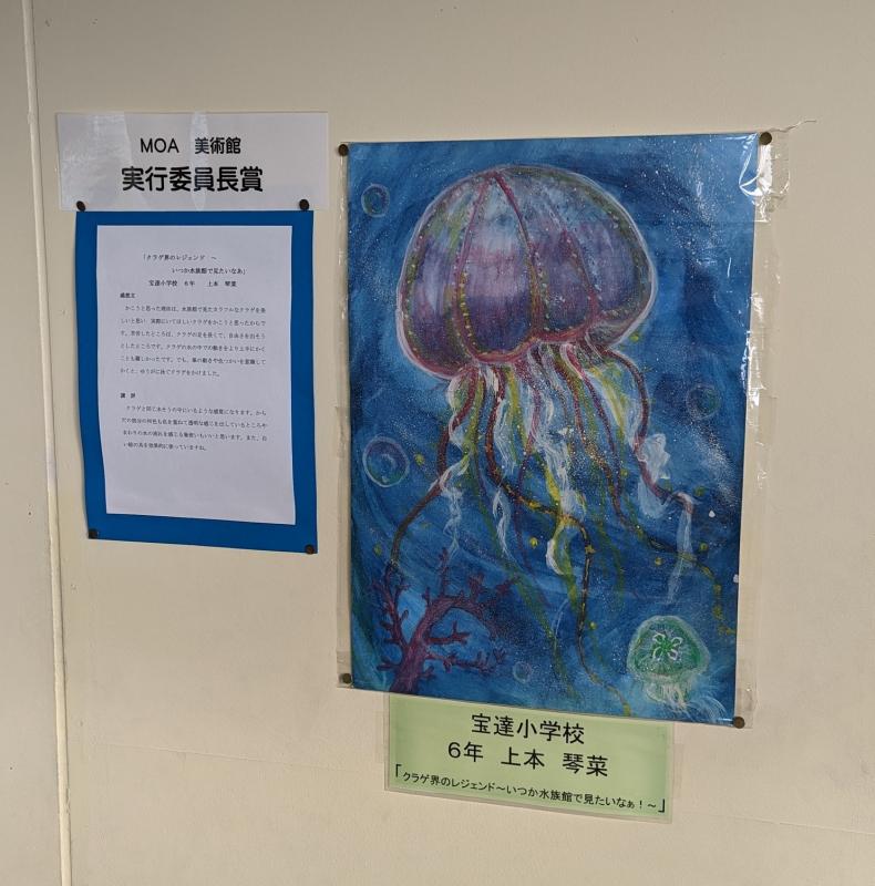 MOA美術館絵画コンクールで6年上本琴菜さんが実行委員長賞を受賞しました。職員室前廊下に掲示してありますので、通知表わたしの際にご覧ください。