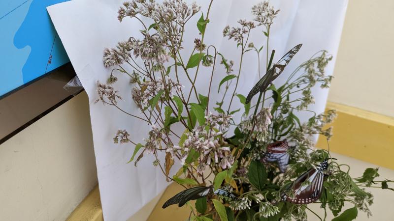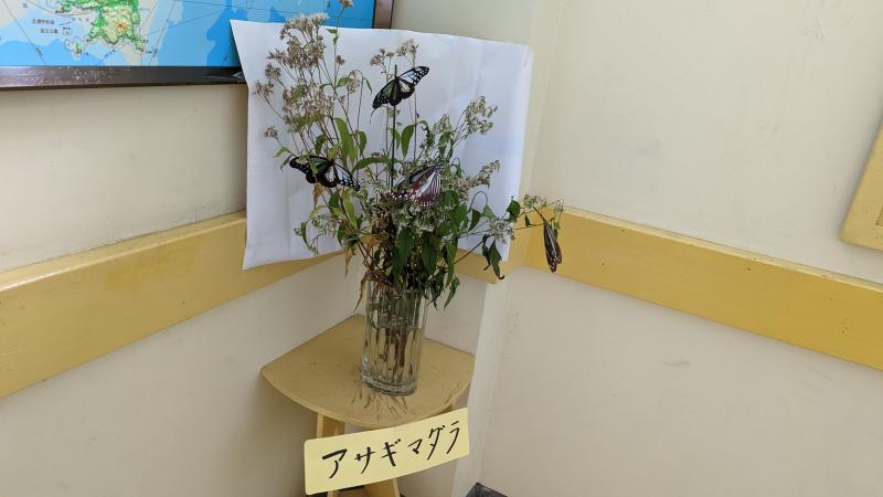 いよいよ明日、アサギマダラのマーキング活動が宝達山で行われます。台風14号の影響が心配ですが、たくさんのアサギマダラが確認できるといいです。アサギマダラが密を吸いにやってくる植物はいくつか確認されています。写真は、アサギマダラの校内展示です。