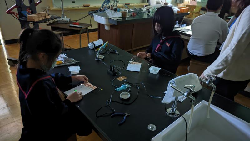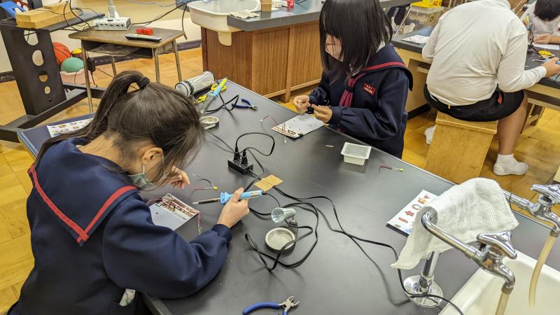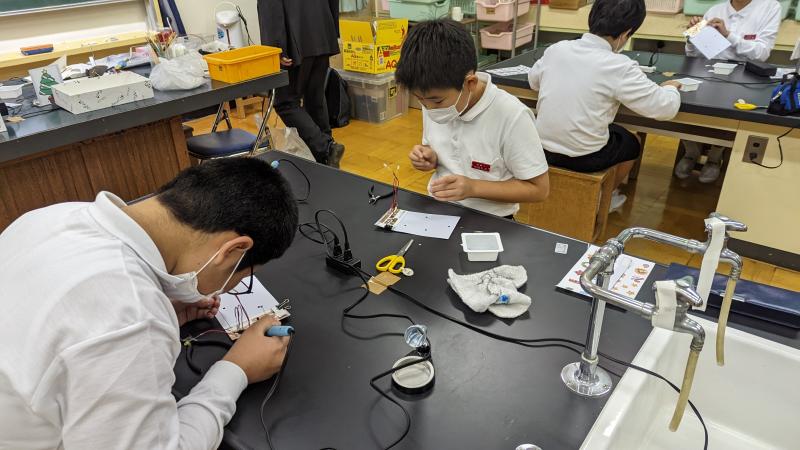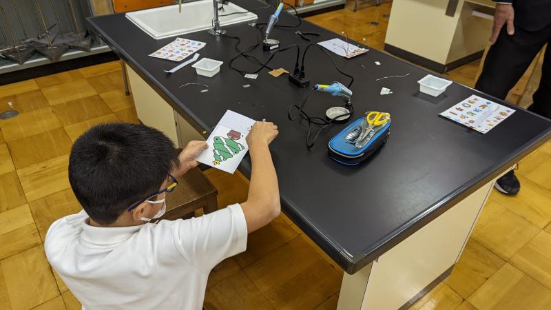 菖蒲田英夫先生を講師に迎え、この日は5年生を対象に子ども科学実験教室がありました。センサーを利用してLEDライトを点灯させる、クリスマス用ディスプレイの工作に取り組みました。
