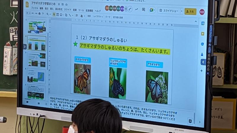 3年生が総合の時間にアサギマダラについて調べたことを、スライドにまとめ、クラスのともだちにプレゼンテーションしました。