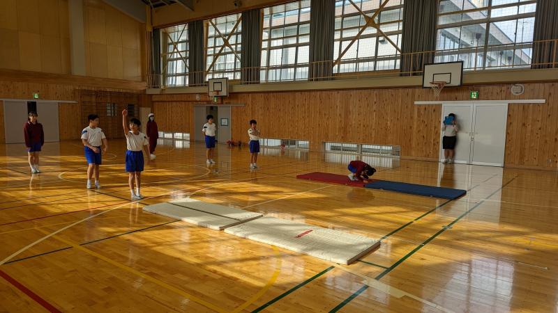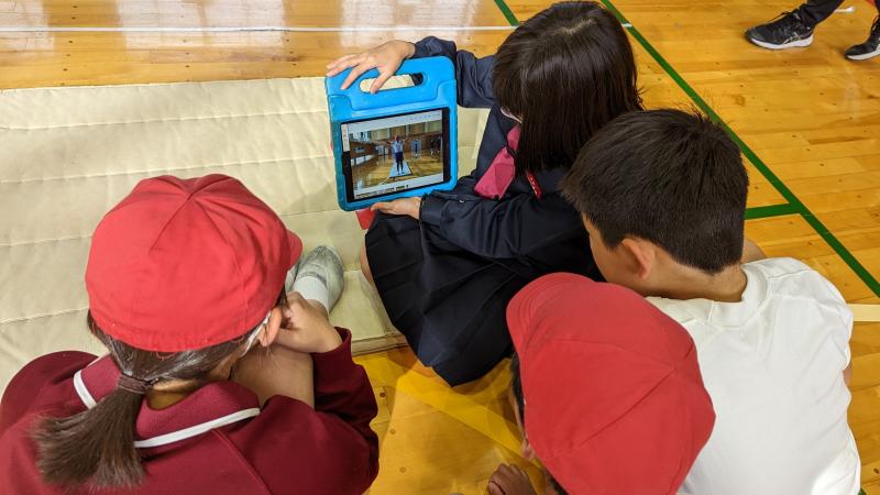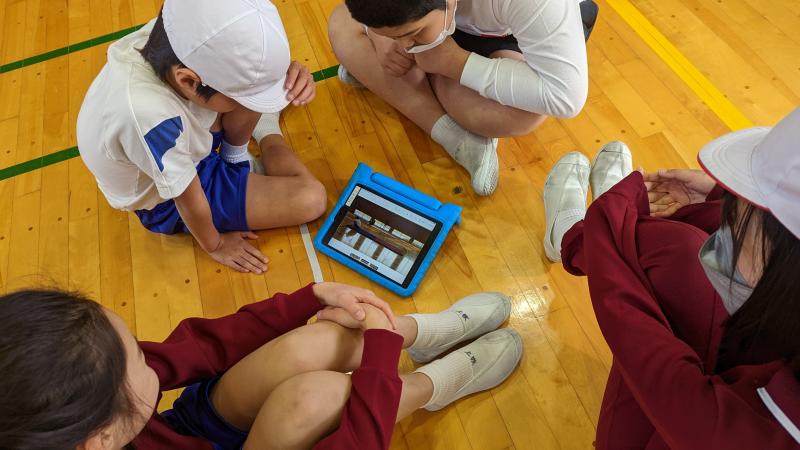 5年生が体育でマット運動の学習をしています。各自の技をタブレット端末で撮影し、修正箇所について話し合っています。自分で直接自分の技を見ることはできないので、タブレット端末を使った学習はとても有効です。