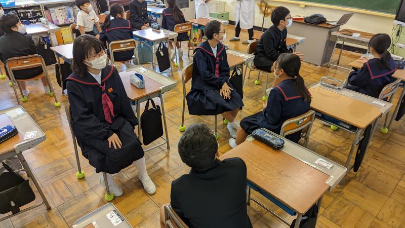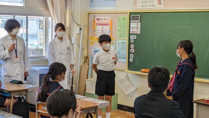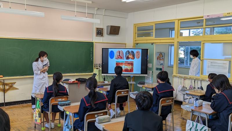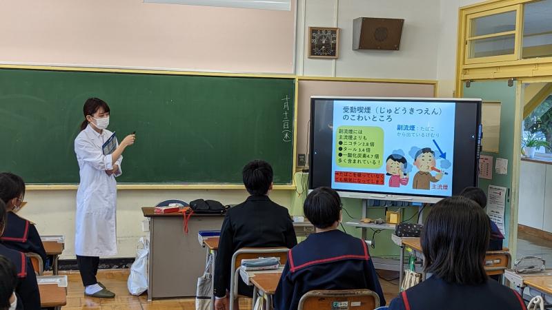 瑠璃光薬局の佐藤学校薬剤師さんと薬学生の日高さんを講師に迎え、薬物乱用防止教室が開かれました。はじめに、スライドの使いながら学校薬剤師の仕事を紹介してくださいました。その後、タバコを中心とした薬物の危険性の説明、喫煙を勧められたときの断り方をロールプレイで体験しました。