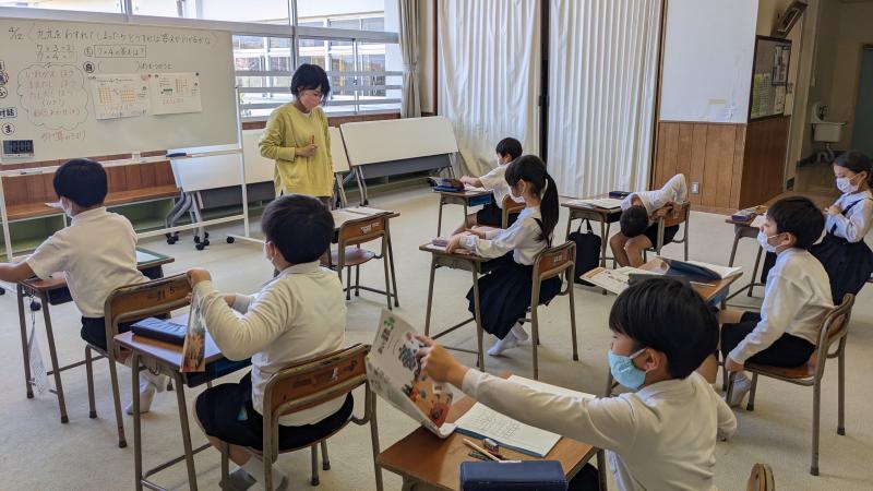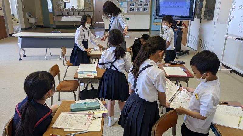 2・3年の算数科の複式授業がありました。2・3年生が教室の前後に分かれて別々の教材を学習します。先生がついていない時間帯の学年の学習は「学習リーダー」が進めます。また,特別支援教育支援員がサポートします。