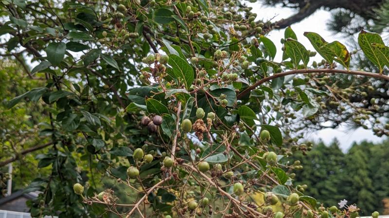 「サルスベリ」でした。実は食用にはなりませんが、葉と実が一緒に落ちるので、ドライフラワーのようにクラフトの材料にする方もいるようです。