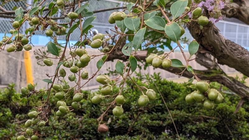 答えは「百日紅(サルスベリ)」。2ヶ月ほど、可愛いピンクの花を楽しむことができましたが、10月に入り、そろそろ終わりのようです。花より実のほうが大きいのですね。
