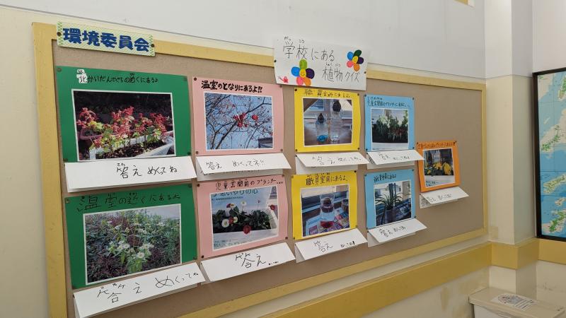 環境委員会の掲示板がリニューアルしましたね。子どもたちが作った植物のクイズです。