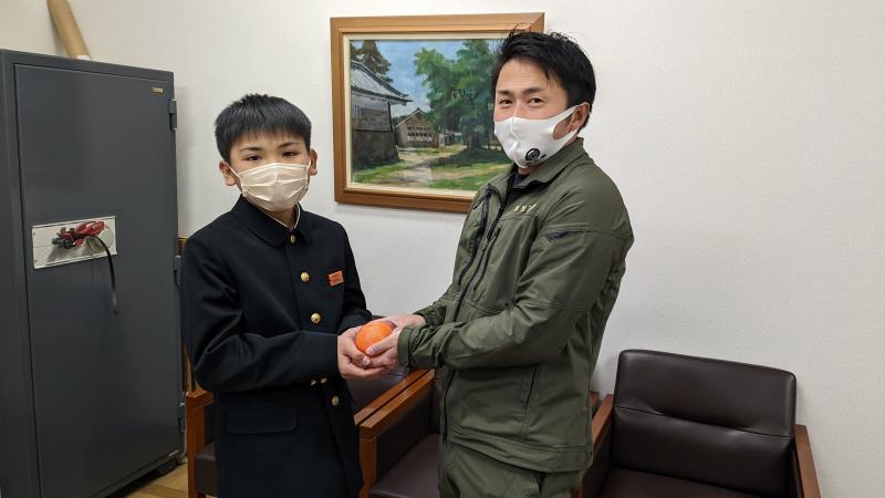 先日、6年生が集合学習で紋平柿の収穫体験に行ってきました。(株)宝生果さんのご厚意で、子どもたちと職員全員に紋平柿をいただけることになり、この日は、代表の宮本 憲さんから6年の中村 将人さんに贈呈していただく場を設けました。