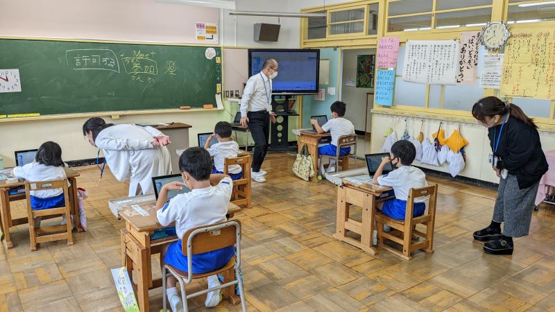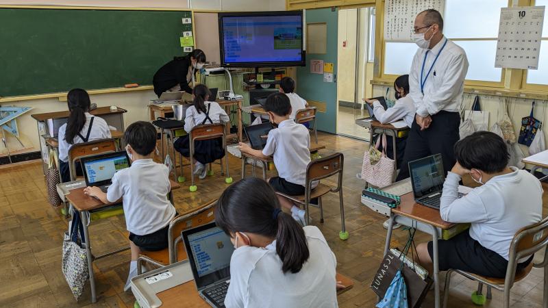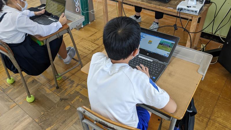 1年生が、プログラミングの学習アプリ「Scratch(スクラッチ)」を使って、プログラミングの基本的な学習をしました。講師は、ICTサポーターの上田さんと中町さんです。