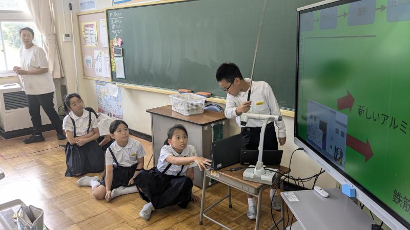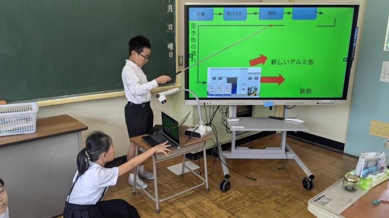 4年生が社会で見学した「クリンクル羽咋」の学習のまとめをしています。スライドを作成し、5年生に聞いてもらいます。