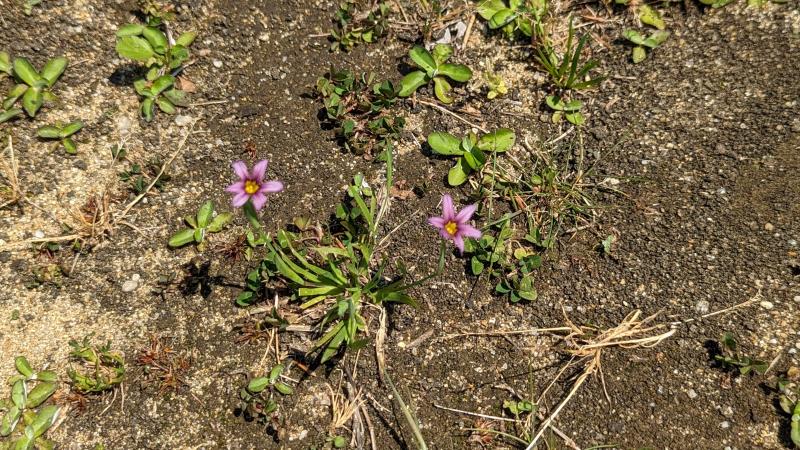 アヤメの仲間で「ニワゼキショウ(庭石菖)」です。明治時代にアメリカから入ってきた種類だと言われています。(諸説あります。)色はピンク色ですが、白色もあるようです。