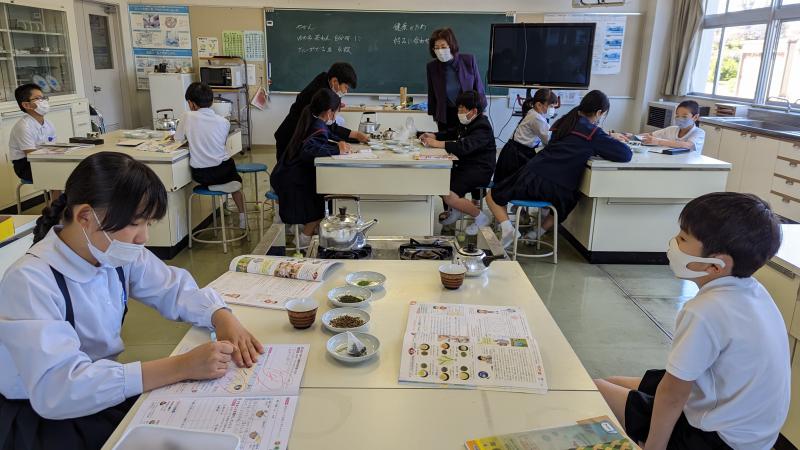 5年生がお茶の入れ方の勉強をしていました。お茶の種類によって入れ方が違うことに驚いていましたよ。お家のひとにも入れてあげよう!