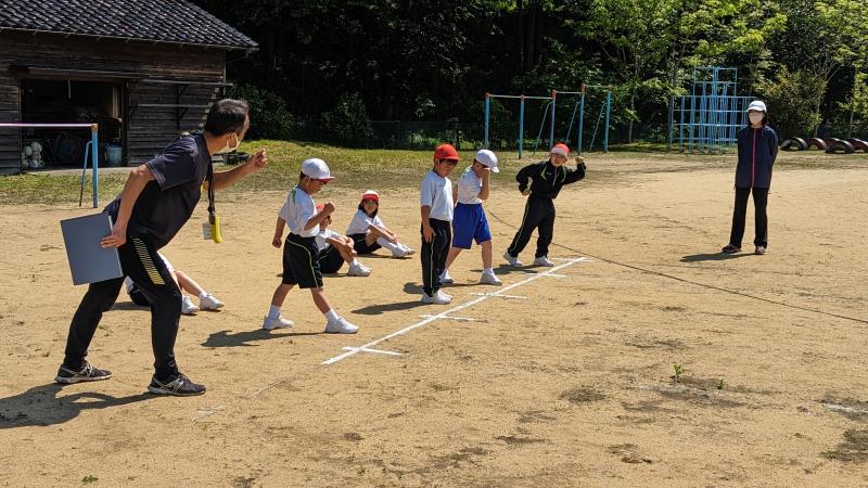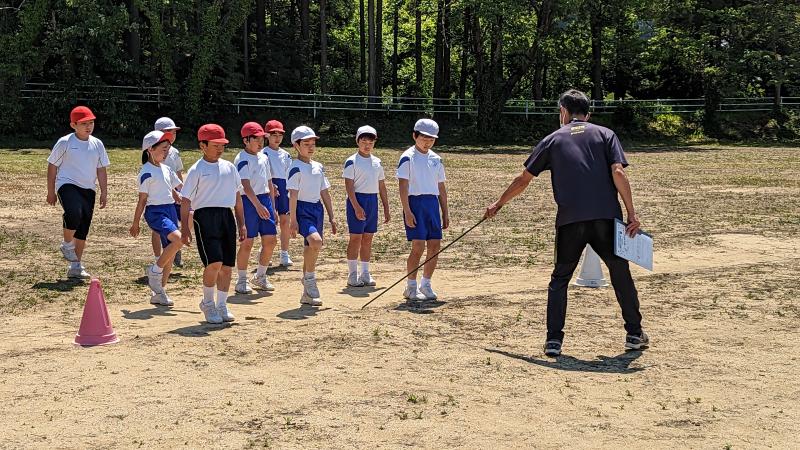 1年生と4年生が運動会の個走の練習をしていました。今年も合図は英語です。「On Your Marks!Set!(Bang!)」