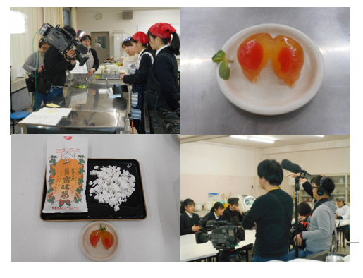 本校家庭部がNHK金沢放送局のニュース番組「かがのとイブニング」の取材を受けました。地元の特産品である「宝達葛」を使ったお菓子作りを紹介するリポートに本校家庭部が出演します。紹介したお菓子は生徒が考案した新作のジュエルスイーツ『トマトinトマト』です。町の特産品「志宝トマト」の果汁を丸型の寒天ゼリーにし、ドライトマトのシロップ漬けを練りこんだ宝達葛餅に包みました。中に仕込んだミントの葉もさわやかなアクセントになっています。生徒が一生懸命紹介する様子をぜひご覧下さい。