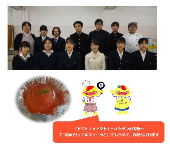 16時~18時、松月堂さんで「トマトinトマト~オムタンの宝物~」の試食販売会が行われました。家庭部員4人が、お客さんに試食を勧めたり、スイーツの紹介をしました。プロの手によって商品化した「トマトinトマト」は金箔があしらわれ、本当に宝物のようでした。パッケージのデザインは、部員全員で考えたものから選んでもらいました。